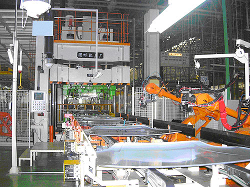 车门包边液压机是为汽车制造厂开发的专用液压机,具有速度快、自动化程度高、工作柔性化程度?等特点,广泛应用于于汽车车门的包边工艺。本系列液压机由主机和快速换模系统组成,快速换模系统采用具有自主知识产权的移动工作台模具置换装置,包括多只移动?作台的组合、换模小车、储模系统和模具快速夹紧系统、控制系统。公称压力:1500~5000KN